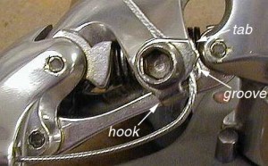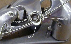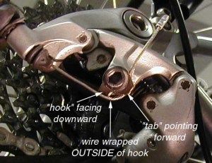 When using Campagnolo 10-speed Ergo-levers however the “hooked washer” must be turned 90 degrees so that the “hook” is facing the rear wheel and the “tab” is pointing directly forward. The wire is then wrapped tightly around the hook and clamped beneath the tab so that the wire points outward away from the bike. The wire should then be running perpendicular across the small groove in the body of the derailleur.
