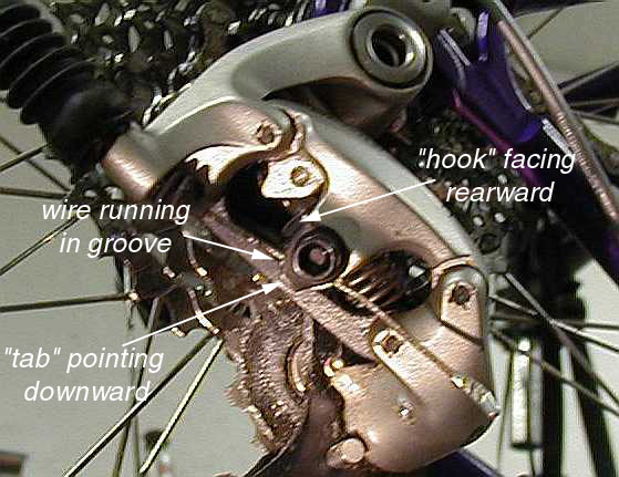 The pinch-bolt on the rear derailleur, which secures the wire, should have a hooked washer between the head of the screw and extension from the parallelogram. Normally when using a Shimano shift-lever the hook faces rearward and the tab, which clamps the cable, points inward toward the rear wheel. The wire rests in the small groove in the body of the derailleur and points forward.